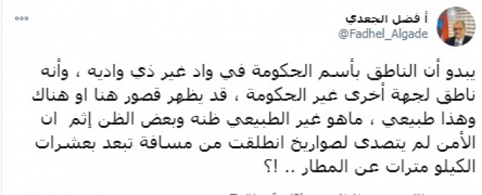 وأوضح في تغريدة على حسابه بموقع التدوين المصغر تويتر، اليوم أنه: "يبدو أن الناطق باسم الحكومة في واد غير ذي واديه، وأنه ناطق لجهة أخرى غير الحكومة".