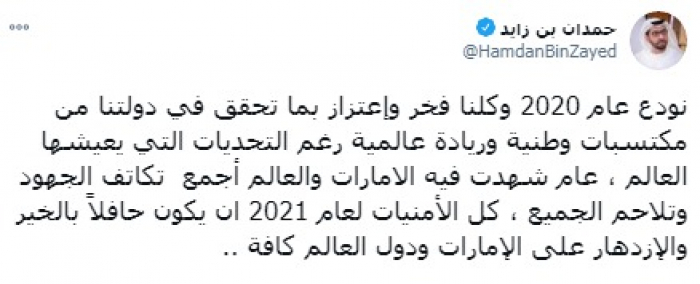 وشدد على أنه: "عام شهدت فيه الإمارات والعالم أجمع تكاتف الجهود وتلاحم الجميع، كل الأمنيات لعام 2021 أن يكون حافلًا بالخير والازدهار على الإمارات ودول العالم كافة".