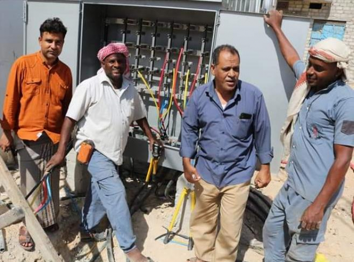 واصل عمال مؤسسة الكهرباء في ساحل حضرموت، تحسين شبكة توزيع التيار الكهربائي، في منطقة فوة ابن سيناء.