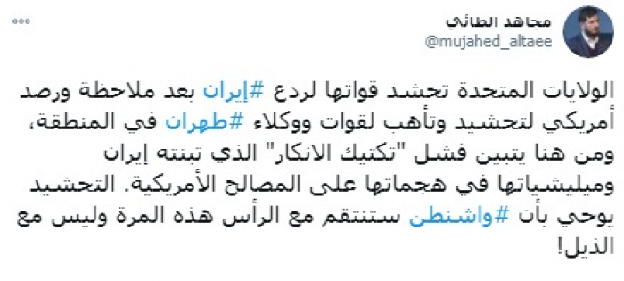 وقال في تغريدة على حسابه بموقع التدوين المصغر تويتر، اليوم إن: "الولايات المتحدة تحشد قواتها لردع إيران بعد ملاحظة ورصد أمريكي لتحشيد وتأهب لقوات ووكلاء طهران في المنطقة".