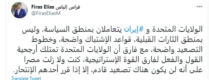 وقال في تغريدة عبر "تويتر" رصدها "المشهد العربي": "الولايات المتحدة وإيران يتعاملان بمنطق السياسة، وليس بمنطق الثارات القبلية، قواعد الإشتباك واضحة، وخطوط التصعيد واضحة، مع فارق أن الولايات المتحدة تمتلك أرجحية القول والفعل لفارق القوة الإستراتيجية، كنت ولا زلت مصرا على أنه لن يكون هناك تصعيد قادم، إلا إذا قرر أحدهم الإنتحار".