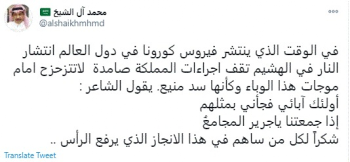 وقال في تغريدة عبر "تويتر" رصدها "المشهد العربي": "في الوقت الذي ينتشر فيروس كورونا في دول العالم انتشار النار في الهشيم تقف إجراءات المملكة صامدة لاتتزحزح أمام موجات هذا الوباء وكأنها سد منيع. يقول الشاعر: أولئك آبائي فجأني بمثلهم إذا جمعتنا ياجرير المجامعُ شكراً لكل من ساهم في هذا الانجاز الذي يرفع الرأس".