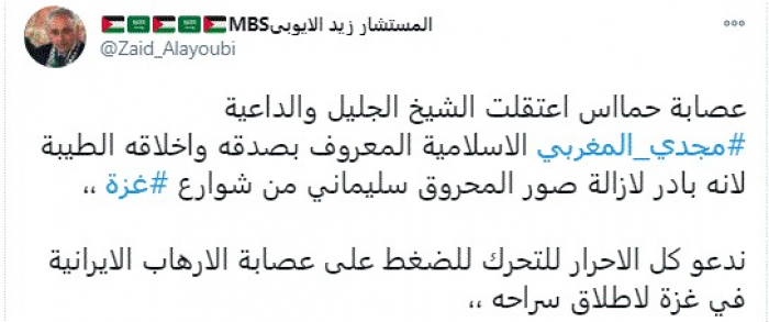 وقال في تغريدة عبر "تويتر" رصدها "المشهد العربي": "عصابة حماس اعتقلت الشيخ الجليل والداعية مجدي المغربي الإسلامي المعروف بصدقه وأخلاقه الطيبة لأنه بادر بإزالة صور المحروق سليماني من شوارع غزة".