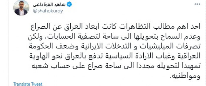 دعا الكاتب الصحفي العراقي شاهو القرةداغي، اليوم، لإبعاد العراق عن تصفية الحسابات لصالح إيران.