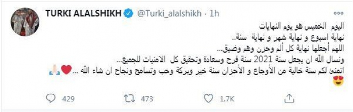 وغرّد تركي "اليوم هو يوم النهايات، نهاية أسبوع ونهاية شهر ونهاية سنة.. اللهم اجعلها نهاية كل ألم وحزن وهم وضيق".