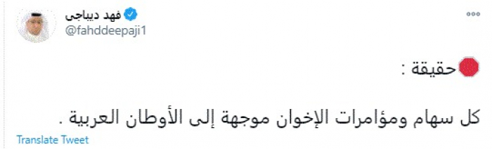 وقال في تغريدة عبر "تويتر" رصدها "المشهد العربي": "حقيقة: كل سهام ومؤامرات الإخوان موجهة إلى الأوطان العربية".