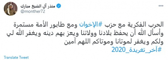 وكتب في تغريدة عبر "تويتر" رصدها "المشهد العربي": "الحرب الفكرية مع حزب الإخوان ومع طابور الأمة مستمرة وأسأل الله أن يحفظ بلادنا وولاتنا ويعز بهم دينه ويغفر الله لي ولكم ويغفر لموتانا وموتاكم اللهم آمين".