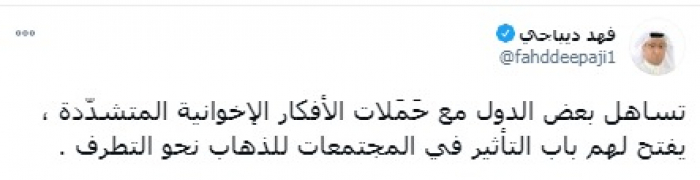 وأشار في تغريدة على حسابه بموقع التدوين المصغر تويتر، اليوم إلى أن: "تساهل بعض الدول مع حَمَلات الأفكار الإخوانية المتشدّدة، يفتح لهم باب التأثير في المجتمعات للذهاب نحو التطرف" .