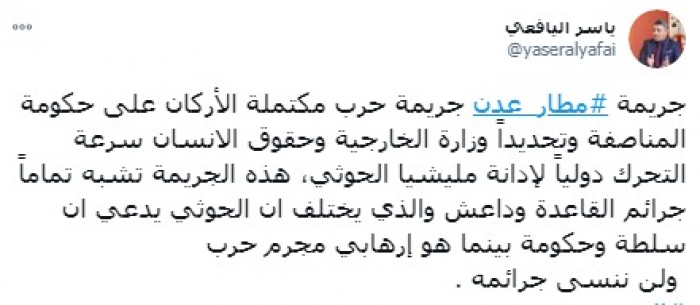 وأوضح في تغريدة على حسابه بموقع التدوين المصغر تويتر، اليوم أن: "جريمة مطار عدن جريمة حرب مكتملة الأركان".