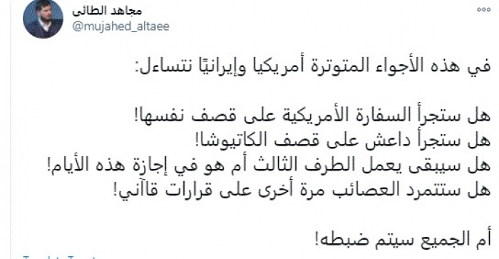 وقال في تغريدة عبر "تويتر" رصدها "المشهد العربي": "في هذه الأجواء المتوترة أمريكيا وإيرانيًا نتساءل: هل ستجرأ السفارة الأمريكية على قصف نفسها.. هل ستجرأ داعش على قصف الكاتيوشا".
