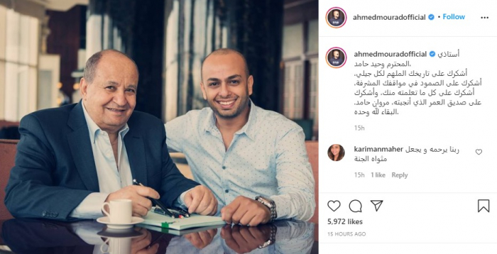 وكتب مراد، عبر حسابه على إنستجرام :"أستاذي المحترم وحيد حامد، أشكرك على تاريخك الملهم لكل جيلي.. أشكرك على الصمود في مواقفك المشرفة، على كل ما تعلمته منك، وأشكرك على صديق العمر الذي أنجبته مروان حامد.. البقاء لله وحده".