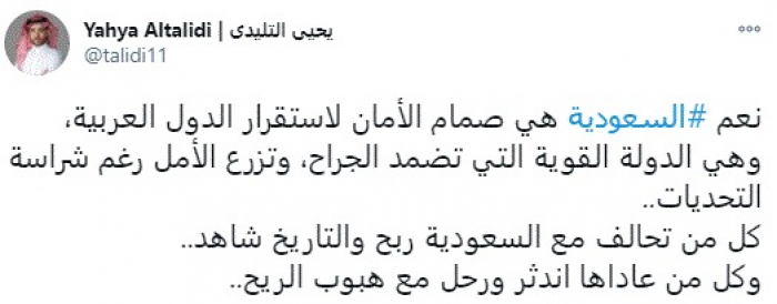 وكتب في تغريدة عبر "تويتر" رصدها "المشهد العربي": "نعم السعودية هي صمام الأمان لاستقرار الدول العربية، وهي الدولة القوية التي تضمد الجراح، وتزرع الأمل رغم شراسة التحديات".