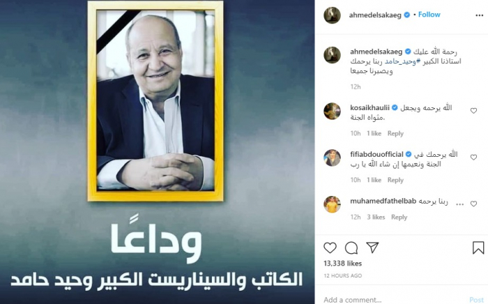 نشر "السقا" صورة لوحيد حامد، عبر حسابه الرسمي بموقع "إنستجرام"، علق :" رحمة الله عليك استاذنا الكبير وحيد حامد ربنا يرحمك ويصبرنا جميعا".