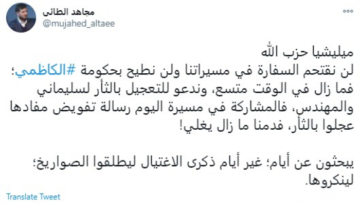 وقال في تغريدة عبر "تويتر" رصدها "المشهد العربي": "مليشيا حزب الله لن نقتحم السفارة في مسيراتنا ولن نطيح بحكومة الكاظمي؛ فما زال في الوقت متسع، وندعو للتعجيل بالثأر لسليماني والمهندس، فالمشاركة في مسيرة اليوم رسالة تفويض مفادها عجلوا بالثأر، فدمنا ما زال يغلي! يبحثون عن أيام؛ غير أيام ذكرى الاغتيال ليطلقوا الصواريخ؛ لينكروها".
