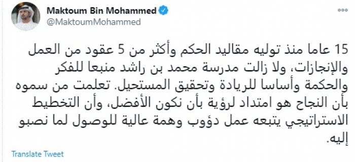 وقال في تغريدة عبر "تويتر" رصدها "المشهد العربي": "15 عاما منذ توليه مقاليد الحكم وأكثر من 5 عقود من العمل والإنجازات، ولا زالت مدرسة محمد بن راشد منبعا للفكر والحكمة وأساسا للريادة وتحقيق المستحيل".