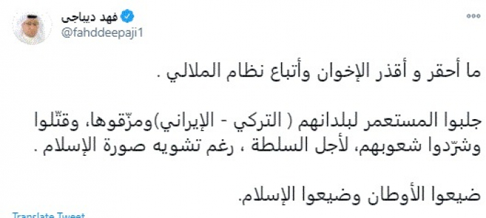 وقال في تغريدة عبر "تويتر" رصدها "المشهد العربي": "ما أحقر وأقذر الإخوان وأتباع نظام الملالي. جلبوا المستعمر لبلدانهم ( التركي - الإيراني)ومزّقوها، وقتّلوا وشرّدوا شعوبهم، لأجل السلطة، رغم تشويه صورة الإسلام".