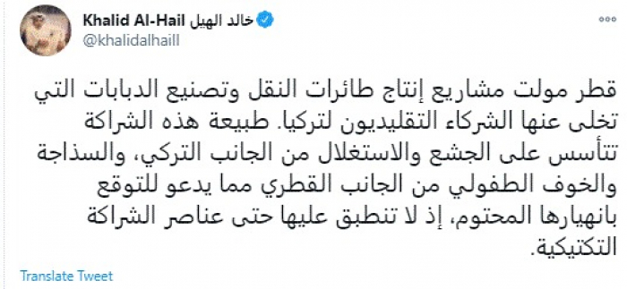 توقع المعارض القطري البارز خالد الهيل، اليوم، انهيار الشراكة القطرية التركية الخاصة بالصناعات الدفاعية العسكرية التركية.