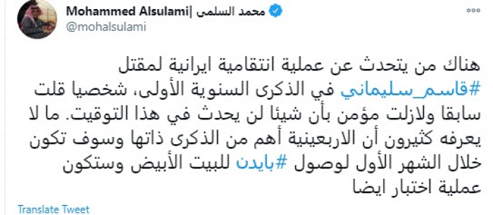 وقال في تغريدة عبر "تويتر" رصدها "المشهد العربي": "هناك من يتحدث عن عملية انتقامية ايرانية لمقتل قاسم سليماني في الذكرى السنوية الأولى، شخصيا قلت سابقا ولازلت مؤمن بأن شيئا لن يحدث في هذا التوقيت".