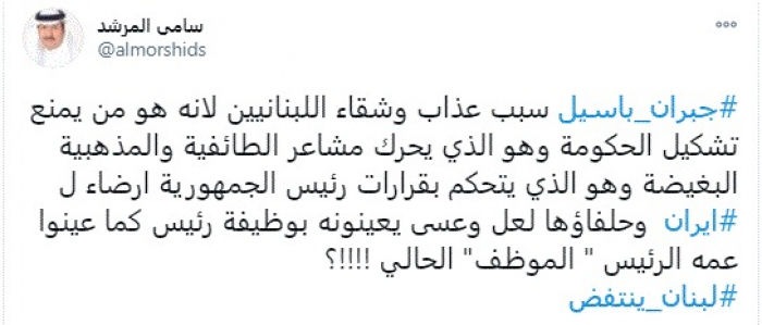 وكتب في تغريدة عبر "تويتر" رصدها "المشهد العربي": "جبران باسيل سبب عذاب وشقاء اللبنانيين لأنه هو من يمنع تشكيل الحكومة وهو الذي يحرك مشاعر الطائفية والمذهبية البغيضة وهو الذي يتحكم بقرارات رئيس الجمهورية إرضاء لإيران وحلفاؤها لعل وعسى يعينونه بوظيفة رئيس كما عينوا عمه الرئيس الموظف الحالي".