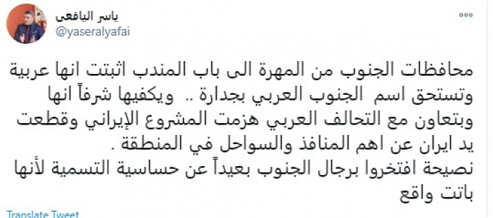 وكتب في تغريدة عبر "تويتر" رصدها "المشهد العربي": "محافظات الجنوب من المهرة إلى باب المندب أثبتت أنها عربية وتستحق اسم الجنوب العربي بجدارة.. ويكفيها شرفًا أنها وبتعاون مع التحالف العربي هزمت المشروع الإيراني وقطعت يد إيران عن أهم المنافذ والسواحل في المنطقة".