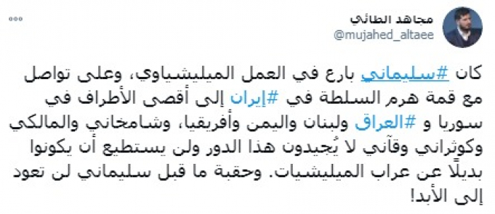 وأوضح في تغريدة على حسابه بموقع التدوين المصغر تويتر، اليوم أنه: "كان سليماني بارع في العمل الميليشياوي، وعلى تواصل مع قمة هرم السلطة في إيران إلى أقصى الأطراف في سوريا والعراق ولبنان واليمن وأفريقيا".