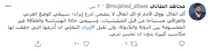 وشدد في تغريدة على حسابه بموقع التدوين المصغر تويتر، اليوم على أن: "أي اتفاق نووي قادم أو أي اتفاق لا يتضمن أذرع إيران؛ سيبقي الوضع العربي والعراقي مستباحًا من قبل الميليشيات".