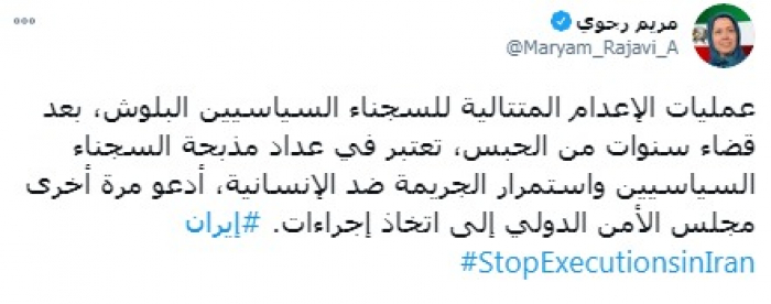 وأكدت في تغريدة على حسابها بموقع التدوين المصغر تويتر، اليوم أن: "عمليات الإعدام المتتالية للسجناء السياسيين البلوش، بعد قضاء سنوات من الحبس، تعتبر في عداد مذبحة السجناء السياسيين واستمرار الجريمة ضد الإنسانية".