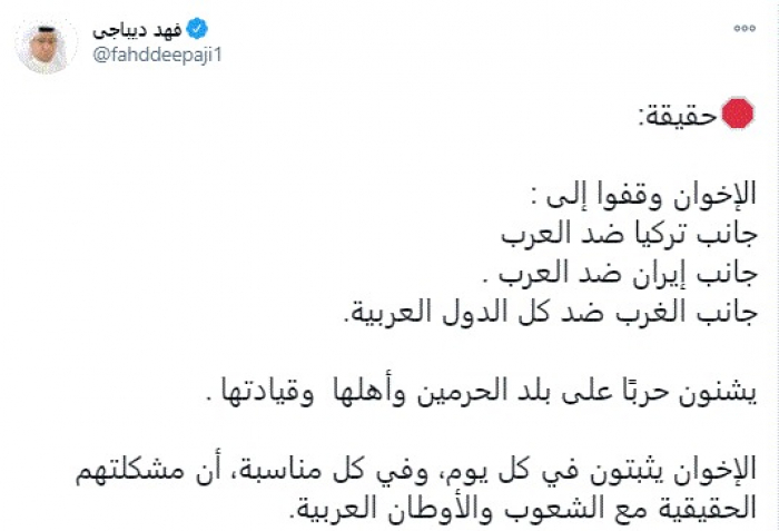 وقال في تغريدة عبر "تويتر" رصدها "المشهد العربي": "حقيقة: الإخوان وقفوا إلى : جانب تركيا ضد العرب جانب إيران ضد العرب. جانب الغرب ضد كل الدول العربية. يشنون حربًا على بلد الحرمين وأهلها وقيادتها".