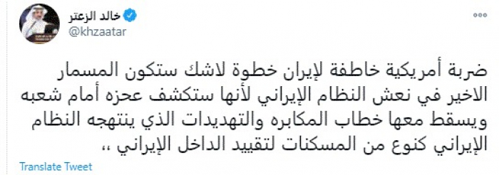 وكتب في تغريدة عبر "تويتر" رصدها "المشهد العربي": "ضربة أمريكية خاطفة لإيران خطوة لا شك ستكون المسمار الأخير في نعش النظام الإيراني لأنها ستكشف عجزه أمام شعبه ويسقط معها خطاب المكابرة والتهديدات الذي ينتهجه النظام الإيراني كنوع من المسكنات لتقييد الداخل الإيراني".