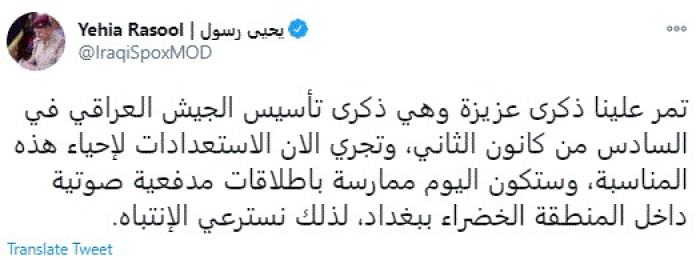 وقال في تغريدة عبر "تويتر" رصدها "المشهد العربي": "تمر علينا ذكرى عزيزة وهي ذكرى تأسيس الجيش العراقي في السادس من كانون الثاني، وتجري الان الاستعدادات لإحياء هذه المناسبة، وستكون اليوم ممارسة باطلاقات مدفعية صوتية داخل المنطقة الخضراء ببغداد، لذلك نسترعي الإنتباه".
