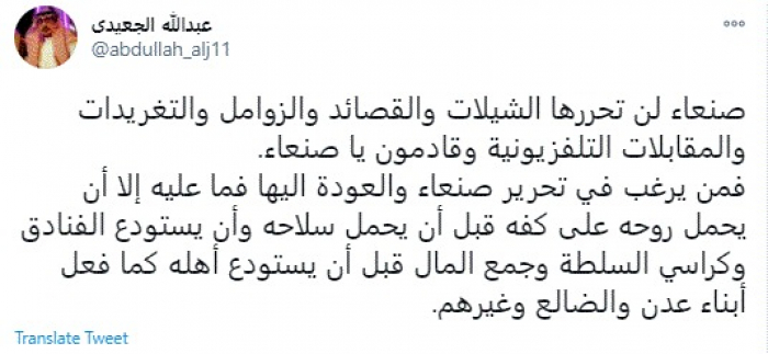 وكتب في تغريدة عبر "تويتر" رصدها "المشهد العربي": "صنعاء لن تحررها الشيلات والقصائد والزوامل والتغريدات والمقابلات التلفزيونية وقادمون يا صنعاء".