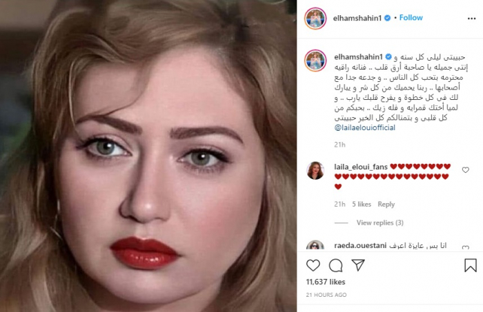 ونشرت إلهام صورة للفنانة ليلى علوي، عبر حسابها الرسمي بموقع "إنستجرام"، علقت :" حبيبتى ليلى كل سنه و إنتى جميلة يا صاحبة أرق قلب، فنانة راقية محترمة بتحب كل الناس، وجدعة جدا مع أصحابها، ربنا يحميك من كل شر و يبارك لك في كل خطوة و يفرح قلبك يارب، و لميا أختك قمرايه وفله زيك، بحبكم من كل قلبي و بتمنالكم كل الخير حبيبتي".