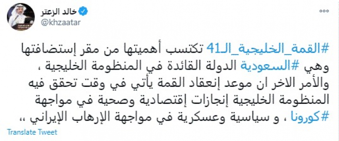 وقال في تغريدة عبر "تويتر" رصدها "المشهد العربي": "القمة الخليجية الـ41 تكتسب أهميتها من مقر إستضافتها وهي السعودية الدولة القائدة في المنظومة الخليجية ، والأمر الاخر أن موعد انعقاد القمة يأتي في وقت تحقق فيه المنظومة الخليجية إنجازات إقتصادية وصحية في مواجهة كورونا، و سياسية وعسكرية في مواجهة الإرهاب الإيراني".