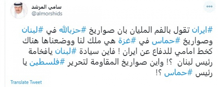 وقال في تغريدة عبر "تويتر" رصدها "المشهد العربي": "إيران تقول بالفم المليان بأن صواريخ حزب الله في لبنان وصواريخ حماس في غزة هي ملك لنا ووضعناها هناك كخط أمامي للدفاع عن إيران".
