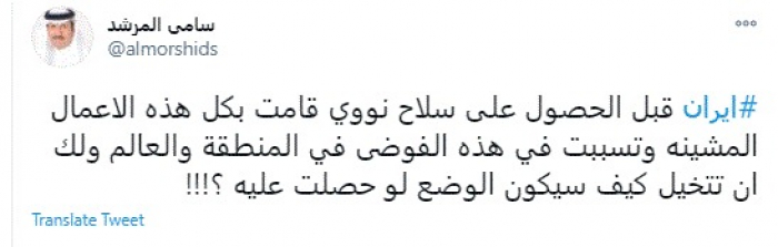 وقال في تغريدة عبر "تويتر" رصدها "المشهد العربي": "إيران قبل الحصول على سلاح نووي قامت بكل هذه الأعمال المشينة وتسببت في هذه الفوضى في المنطقة والعالم ولك أن تتخيل كيف سيكون الوضع لو حصلت عليه؟".