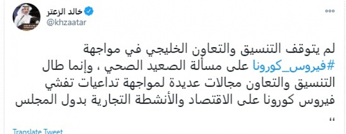 وقال في تغريدة عبر "تويتر" رصدها "المشهد العربي": "لم يتوقف التنسيق والتعاون الخليجي في مواجهة فيروس كورونا على مسألة الصعيد الصحي، وإنما طال التنسيق والتعاون مجالات عديدة لمواجهة تداعيات تفشي فيروس كورونا على الاقتصاد والأنشطة التجارية بدول المجلس".