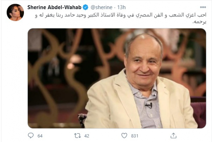 نشرت شيرين صورة وحيد حامد، عبر حسابها الرسمي بموقع "تويتر"، علقت:" أحب أعزي الشعب والفن المصري في وفاة الأستاذ الكبير وحيد حامد ربنا يغفر له ويرحمه".