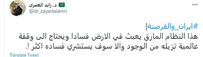 وقال في تغريدة عبر "تويتر" رصدها "المشهد العربي": "إيران والقرصنة| هذا النظام المارق يعبث في الأرض فسادا ويحتاج إلى وقفة عالمية تزيله من الوجود وإلا سوف يستشري فساده أكثر".