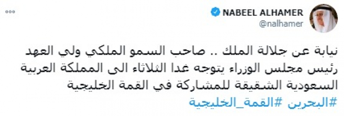 وقال في تغريدة على حسابه بموقع التدوين المصغر تويتر، اليوم إنه: "نيابة عن جلالة الملك.. صاحب السمو الملكي ولي العهد رئيس مجلس الوزراء يتوجه غدا الثلاثاء إلى المملكة العربية السعودية الشقيقة للمشاركة في القمة الخليجية".