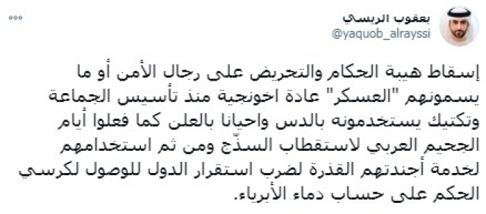 وقال في تغريدة على حسابه بموقع التدوين المصغر تويتر، اليوم إن: "إسقاط هيبة الحكام والتحريض على رجال الأمن أو ما يسمونهم (العسكر) عادة إخونجية منذ تأسيس الجماعة وتكتيك يستخدمونه بالدس وأحيانا بالعلن كما فعلوا أيام الجحيم العربي".