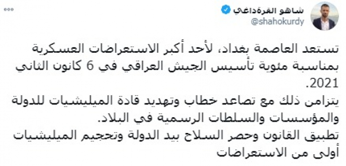 استهجن الكاتب الصحفي العراقي شاهو قرة داغي، انشغال الجيش العراقي بالتحضير لاستعراض عسكري، بدلا من تطبيق القانون والعمل على حصر السلاح بيد الدولة.