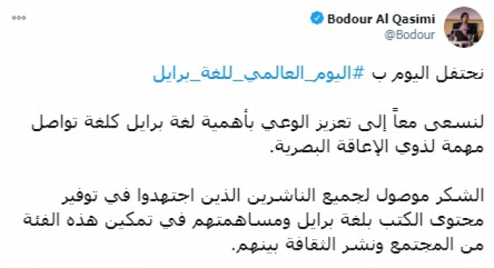 وقالت في تغريدة على حسابها بموقع التدوين المصغر تويتر، اليوم إننا: "نحتفل اليوم باليوم العالمي للغة برايل".
