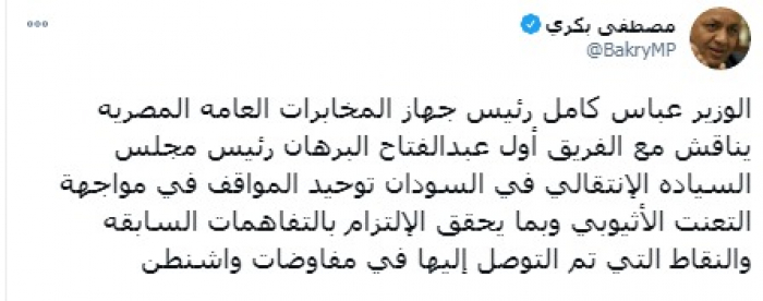 وأشار في تغريدة على حسابه بموقع التدوين المصغر تويتر، اليوم إلى أن: "الوزير عباس كامل رئيس جهاز المخابرات العامة المصرية يناقش مع الفريق أول عبدالفتاح البرهان رئيس مجلس السيادة الانتقالي في السودان توحيد المواقف في مواجهة التعنت الأثيوبي".
