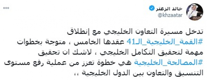 وأوضح في تغريدة على حسابه بموقع التدوين المصغر تويتر، اليوم أنه: "تدخل مسيرة التعاون الخليجي مع انطلاق القمة الخليجية الـ41، عقدها الخامس، متوجة بخطوات مهمة لتحقيق التكامل الخليجي".