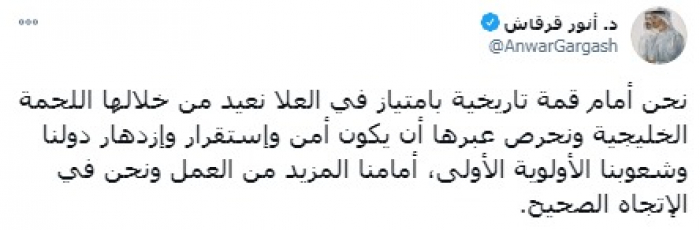 وأكد في تغريدة على حسابه بموقع التدوين المصغر تويتر، اليوم: "نحن أمام قمة تاريخية بامتياز في العلا نعيد من خلالها اللحمة الخليجية".