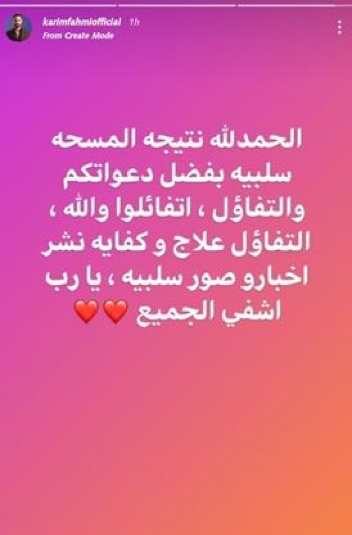 ونشر كريم فهمي صورة، عبر خاصية القصص القصيرة على حسابه بموقع "إنستجرام"، وعلق: "الحمد لله نتيجة المسحة سلبية، بفضل دعواتكم والتفاؤل، اتفائلوا والله، التفاؤل علاج وكفاية نشر أخبار، وصور سلبية، يا رب اشفي الجميع".