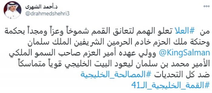 وكتب في تغريدة عبر "تويتر" رصدها "المشهد العربي": "من العلا تعلو الهمم لتعانق القمم شموخاً وعزاً ومجداً بحكمة وحنكة ملك الحزم خادم الحرمين الشريفين الملك سلمان وولي عهده أمير العزم صاحب السمو الملكي الأمير محمد بن سلمان ليعود البيت الخليجي قوياً متماسكاً ضد كل التحديات المصالحة الخليجية".
