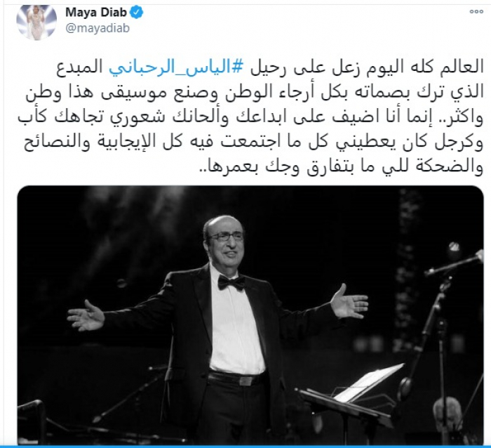 نعت الفنانة اللبنانية مايا دياب، مواطنها الموسيقار الكبير إلياس الرحباني، الذي وافته المنية أمس الإثنين 4 يناير .