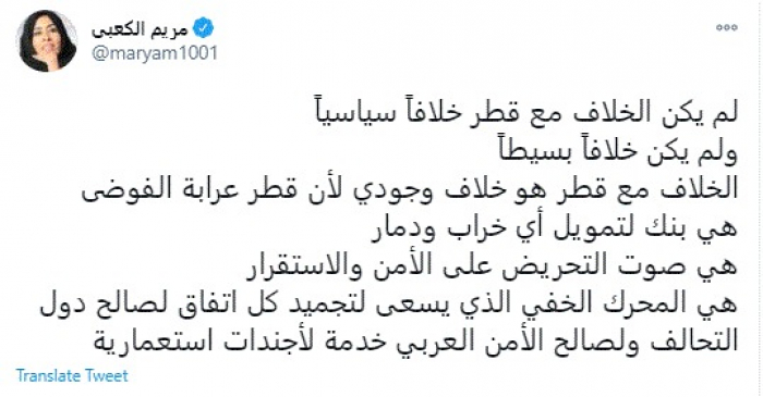 قالت الكاتبة والإعلامية الإماراتية مريم الكعبي، اليوم، إن قطر عرابة الفوضى وبنك لتمويل الخراب والدمار، مؤكدةً أن الخلاف معها وجودي.