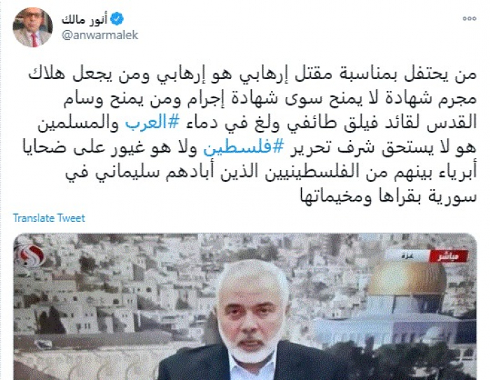 شن الإعلامي الجزائري الدكتور أنور مالك، اليوم، هجومًا حادًا على رئيس المكتب السياسي لحركة حماس إسماعيل هنية، جراء أفعال الحركة تجاه قاسم سليماني بعد مقتله.